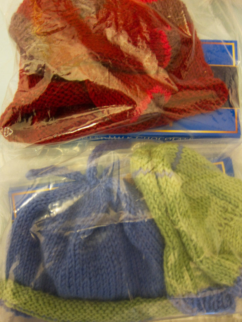Toukka niitä mielellään olisi sovittanut. Pipot saatiin juuri päähän, mutta sukat olivat auttomattomasti liian pienet. Pipojen ohjeet